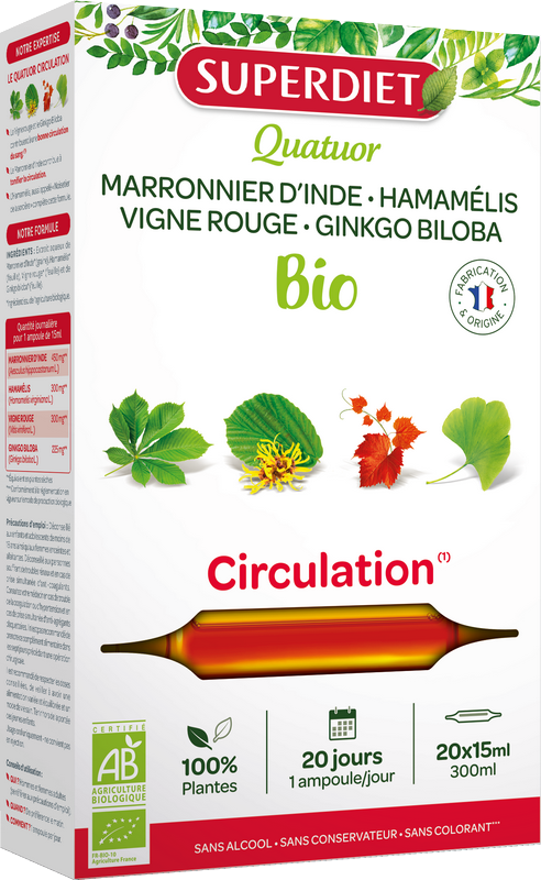 Superdiet a développé pour vous le Quatuor Circulation bio, composé de plantes aux bienfaits reconnus :